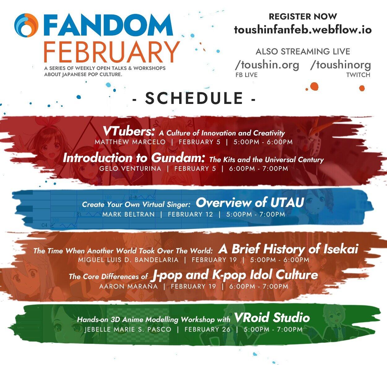 Ateneo de Manila University’s Touyou no Shinju (Toushin) Organization will hold its “Fandom February” talks featuring relevant topics such as VTubers, Gundam, UTAU, Isekai, Idol Culture and 3D Modelling.