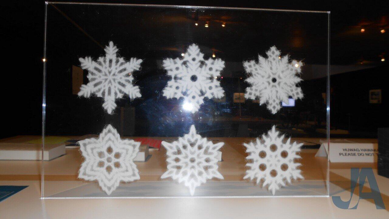 [From left to right] WASHI dECO SNOWFLAKE made out of paper, the miniature accesories that is assembled like Gunplas, and Block 15 degrees.
